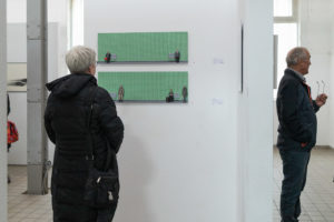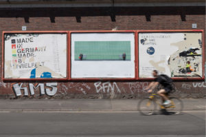People and station were photographed separately and put together afterwards through a composing. Like this, the persons seem even more engrossed and isolated. The panorama view supports the impression of an endless platform, an endless coexistence of humans. The distance between the benches is expanded, but the center stays always empty. Non of the figures is being favored in space, all are the same. Architecture and social patterns are synchronized. All figures look past the camera. We do not get to built eye contact with the subjects, distance is preserved. We see the green tiles of the station; we look on the stage of social isolation and are isolated aswell.